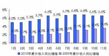 圖1 2010年1~11月通信業(yè)收入累計(jì)增幅 ——移動(dòng)電話用戶增長再創(chuàng)新高,固定電話拆機(jī)放緩