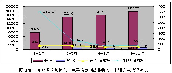 2、經(jīng)濟效益持續(xù)提高。2010年,規(guī)模以上電子信息制造業(yè)實現(xiàn)主營業(yè)務(wù)收入63645億元,同比增長24.1%;實現(xiàn)利潤2825億元,同比 增長57.7%。全行業(yè)銷售利潤率從一季度的2.7%提高到4.4%,高出上年(3.5%)近1個百分點。全行業(yè)虧損企業(yè)3940個,同比下降 19.1%;企業(yè)虧損面(18.8%)比上年同期(26.1%)減少7.3個百分點,虧損企業(yè)虧損額同比下降42.5%。