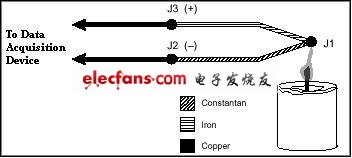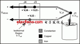 圖3中,J2和J4接點屬于同一類型(銅鎳合金);因為兩者處于等溫環(huán)境,J2和J4也是同樣的溫度。因為電路中電流方向緣故,J4端產(chǎn)生一個Seebeck正電壓,J2端產(chǎn)生一個Seebeck負電壓。因此,接點抵消了相互之間的影響,測量電壓的總量就為零。J1和J3接點都是鐵—銅鎳合金接點。但是他們的溫度可能不同,因為他們可能不是在等溫環(huán)境中。因為他們處于不同溫度環(huán)境下,J1和J3接點都可以產(chǎn)生Seebeck電壓,但是大小不同。為了補償冷端J3,測量其溫度并將其作用電壓從熱電偶測量中減去。
