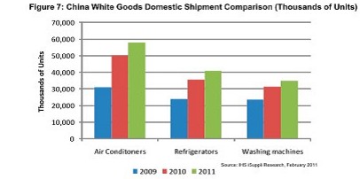 中國政府2010年旨在刺激本地消費的補貼計劃,非常成功地刺激了中國白色家電市場。據(jù)IHS iSuppli公司的研究,2011年繼續(xù)實施補貼計劃將推動白色家電市場進(jìn)一步增長。