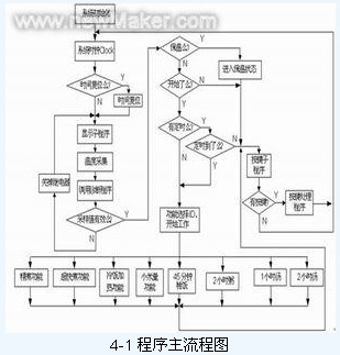 從樣機分析中大致設(shè)計整個系統(tǒng),整個系統(tǒng)輸進包括2個溫度傳感器,5個按鍵;輸出包括2位七段數(shù)碼管、10個發(fā)光二極管、繼電器控制信號等。根據(jù)控制功能,將程序設(shè)計為幾個主要的模塊,程序主流程見圖4-1所示: