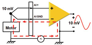 接地環(huán)路會嚴重影響測試結(jié)果,例如,在圖4所示的電路中,為了能夠長時間監(jiān)測一個電機的溫度,在電機上連上一個熱電偶傳感器,由于電機箱是接地的,因此熱電偶也接地,而數(shù)據(jù)采集設(shè)備地與電機箱地之間存在電勢差,因此產(chǎn)生了電流。你可以注意到,加在測試信號的噪聲可能是交流的,或者一個簡單的直流偏移值,但最終無可避免地影響了測試精度。