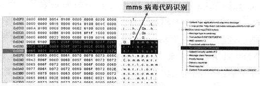 在網(wǎng)絡(luò)運行的過程中,我們收到了如下的用戶投訴:“我的手機出現(xiàn)了1個奇怪的問題,它總是自動隨機發(fā)送MMS消息給我電話薄中的聯(lián)系人”。有的用戶投訴“收到1個可疑彩信,由1個txt文件和1個可執(zhí)行文件組成。txt文件為‘matrixremoveyou,removematrix’”。經(jīng)過確認,這些用戶的手機中了手機彩信病毒。根據(jù)病毒彩信樣本,顯示該病毒為“CommWarrior.A”病毒。具體病毒特征如圖1所示。