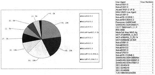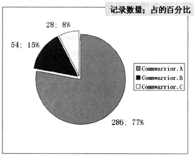 通過GPRS核心網(wǎng)抓包分析,目前用戶感染的彩信病毒類型主要是CommWarrior病毒,A,B,C分別是其的變種類型,具體感染的比例參見圖3。