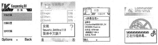 (3)針對目前智能手機感染的典型病毒:CommWarrior、Cabir手機病毒和Mabir.A手機病毒,各軟件公司已經(jīng)陸續(xù)推出了一些防病毒軟件,如NetQin手機殺毒系統(tǒng)、金山手機毒霸、卡巴斯基手機殺毒軟件、光華反病毒手機殺毒軟件SymbianS60、TSG_Phone_Safe_殺手機病毒軟件、Anti-Virus.v1.10、Simworks_AnitiVirus_1.16等。各運營商可以推薦用戶進行相關(guān)軟件的加載,手機廠家也可以根據(jù)自身情況出廠時預(yù)裝一些殺毒軟件(見圖5)。