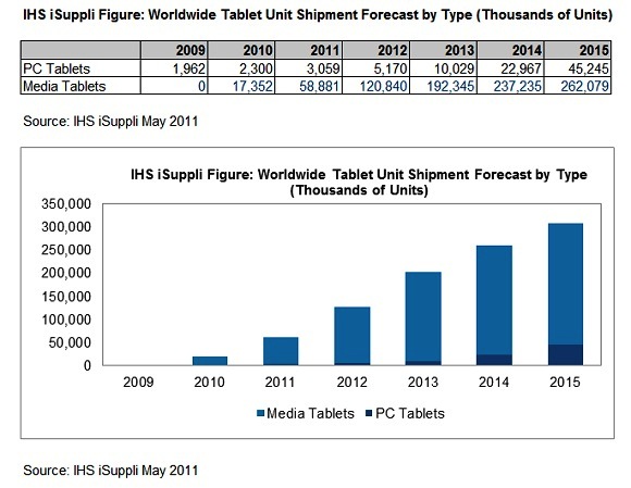 IHS iSuppli估計,在2010年到2015年間,多媒體平板計算機的總出貨量將達到8.887億臺,但同期間PC型平板計算機的出貨量僅有8,880萬臺;在2015年,PC型平板計算機總出貨量預(yù)測為4,520萬臺,該數(shù)字在2010年為230萬臺,期間平均年復(fù)合成長率(CAGR)為81.5%。但在多媒體平板計算機部分,出貨量在2010年為1,740萬臺,2015年將達到2.621億臺,期間CAGR為17.4%。