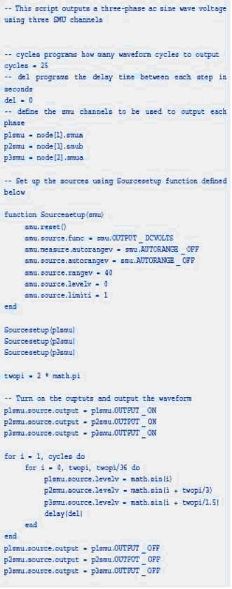 這部分包含許多腳本例子說(shuō)明吉時(shí)利支持腳本的儀器的一些特點(diǎn)。圖1示出了兩臺(tái)吉時(shí)利系統(tǒng)源表如何使用單腳本控制產(chǎn)生3相交流波形。在這個(gè)例子中,使用吉時(shí)利的TSP-Link技術(shù)連接這兩臺(tái)儀器,因而很容易用腳本控制這兩臺(tái)儀器。