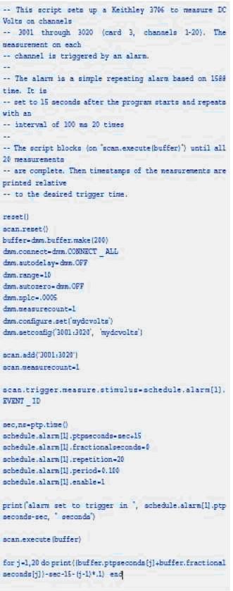 圖2說(shuō)明了基于LXI Class B技術(shù)的定時(shí)器如何控制腳本工作。在此腳本中,吉時(shí)利3706型LXI Class B儀器使用基于IEEE 1588的計(jì)時(shí)器排列一系列測(cè)量的順序。LXI Class B的定時(shí)特點(diǎn)特別適合避免或最小化由延遲或通信時(shí)延導(dǎo)致的系統(tǒng)時(shí)延。