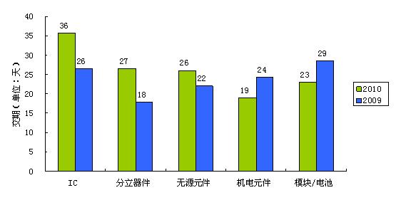 本次調查的結果印證了2010年電子行業(yè)所面臨的“缺貨”困境——2010年電子系統制造商與設計公司面臨的最普遍的采購風險是無法供貨,43.6%的公司面臨著供應商無法供貨的困擾。與2009年的調查做對比,2010年IC、分立器件、無源元件、機電元件、模塊/電池五大類物料價格有不同幅度增長,其中IC與分立器件漲幅最大,機電元件、模塊/電池漲幅最小;交貨期方面,IC、分立器件、無源元件交貨期都有所延長,而機電元件、模塊/電池交貨期分別縮短了5天和6天;貨款結算期方面,IC、分立器件貨款結算期均有所延長,無源元件、機電元件、模塊/電池的貨款結算期都縮短了。