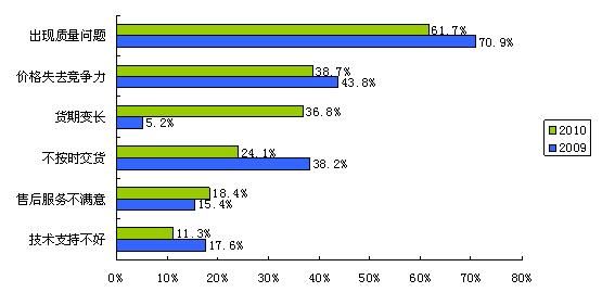 在缺貨的大環(huán)境下,不少電子系統制造商被迫更換供應商。導致合格供應商降級的最主要因素依次是物料出現質量問題、價格失去競爭力和貨期變長。物料質量問題在任何情況下都是不可妥協的;價格失去競爭力也就是價格上漲壓縮了下游公司的利潤空間;而貨期變長導致供應商降級的比例變化最顯著,由2009年的5.2%大幅上升至2010年的36.8%——這是供應鏈調整的表現。因此,系統廠商在考察新供應商時,除了考察物料質量因素外,產品性價比和供貨能力也是重要的考慮因素。