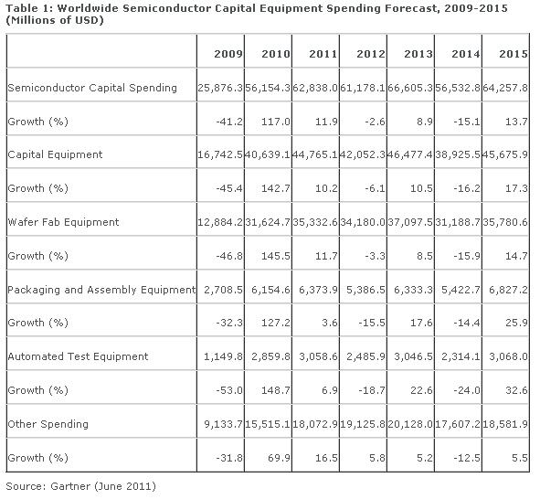 半導體資本設備市場的所有領域預計都將在2011年呈現(xiàn)增長態(tài)勢(見表一)。 Gartner分析師表示,2011年的支出是由積極的晶圓設備制造支出,處于領先的集成設備制造商(IDM)邏輯能力的加速生產,以及內存公司加速雙重曝光等因素推動的。2012年,半導體資本設備支出將下滑2.6%,隨后將在2013年增長8.9%。隨著內存供過于求的影響,周期性的下跌應該在 2013年底出現(xiàn)。