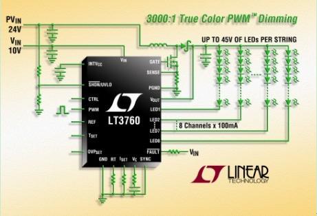 凌力爾特公司 (Linear Technology Corporation) 推出8通道LED驅(qū)動器LT3760,該器件采用一個升壓型DC/DC控制器,每個通道能驅(qū)動高達(dá)45V的100mA LED 串。其內(nèi)部60V、1MHz DC/DC升壓型控制器設(shè)計成面向多達(dá)80個白光LED的恒定電流LED驅(qū)動器。LT3760用一個12V輸入可以驅(qū)動8個通道,每通道多達(dá)10個串聯(lián)的100mA 白光LED,同時提供超過92% 的效率。其多通道能力使該器件非常適用于中型和大型TFT-LCD背光照明應(yīng)用。其6V至40V 的輸入電壓范圍使該器件非常適用于汽車、航空電子設(shè)備、HDTV 和工業(yè)顯示器應(yīng)用。