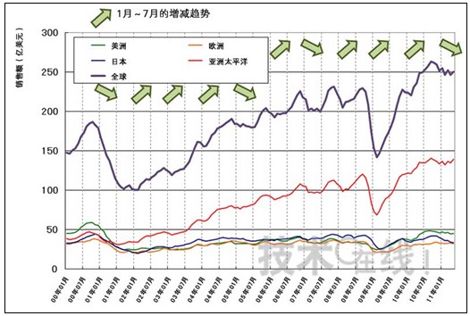 2011年1月份,全球半導(dǎo)體銷(xiāo)售額比上年同月增長(zhǎng)14%,實(shí)現(xiàn)了開(kāi)門(mén)紅。此后,銷(xiāo)售額與上月相比時(shí)增時(shí)減,而從稍長(zhǎng)一點(diǎn)的時(shí)間區(qū)間來(lái)看,銷(xiāo)售額自2010年10月達(dá)到頂峰以后一直在減少。從2001年以后每年上半年的增減趨勢(shì)來(lái)看,增長(zhǎng)的年份居多。這意味著2011年出現(xiàn)了停滯和衰退。