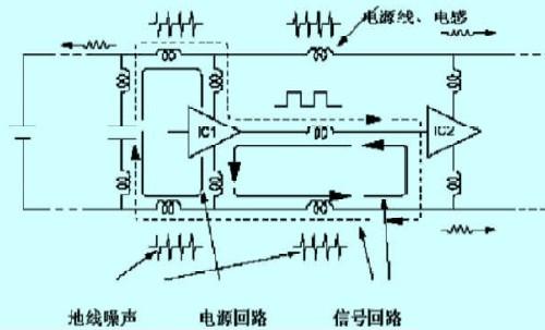 高速數(shù)字電路各類干擾的主要產生原因是由電源自身固有噪聲頻率及外部線路上各類變化的di/dt、du/dt 產生,由于電路板上存在電源回路、信號回路、高速信號回路及附屬在線路上的各類容性、感性負載,因此當信號產生跳變時都將產生一個尖峰沖擊形成噪聲,而這些噪聲將通過各回路的電流環(huán)沿路傳導,因此應當抑制電源自身的固有噪聲及各種高速數(shù)字跳變引起的噪聲。 抑制電路自身或者各類突變信號產生的噪聲,最好的抑制方式就是去耦和濾波。這樣既減少了自身的噪聲也能夠吸收外部對其的影響,提高自身的抗干擾能力。圖1 簡要說明在各個電路階段所產生的噪聲。