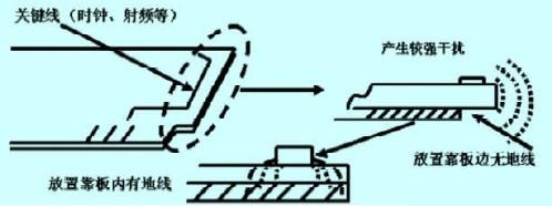 印制電路板的板邊處理是否合理, 決定著是否能夠更加有效地抑制信號的對外干擾。為防止高速數(shù)字電路通過板邊對外干擾, 應該嚴格控制其布線位置, 讓其盡量靠近印制板內部。高頻等干擾較強信號線不應該走到板的邊緣, 以防止無對應地層耦合回路, 產生信號對外的干擾泄漏, 如圖3 所示: