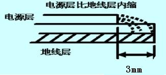 對于高速數(shù)字電路板應該采用多層板, 以減小環(huán)路面積, 將中間層作為電源或地層, 并且盡量保證電源與地相鄰的層間距盡量小;讓每一信號層都有一對應的地線層, 信號線與其地回路構成的環(huán)面積要盡可能小, 環(huán)面積越小, 對外的干擾越少。針對這一特點, 在地平面分割時, 要考慮到地平面與重要信號走線的分布, 防止由于地平面開槽等帶來的問題,信號線不能跨越地平面和電源平面分隔區(qū), 防止形成大的地線回路。同時電源層應該比地線層內縮3 m m 左右的距離, 這樣將能夠抑制70% 以上的電源干擾。如圖2 所示。