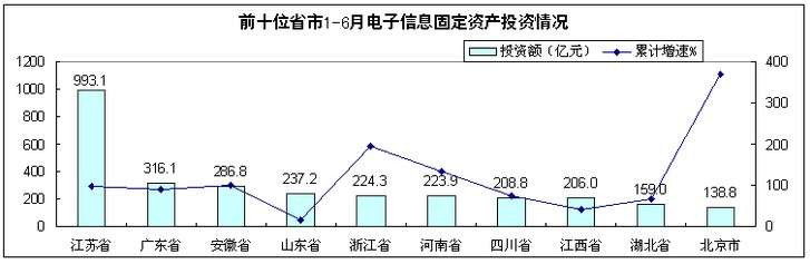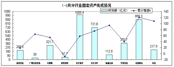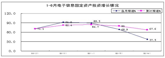 上半年,電子信息產(chǎn)業(yè)500萬元以上項(xiàng)目完成投資3960億元,規(guī)模接近去年前三季度水平,同比增長67.6%,高于去年同期26.6個百分點(diǎn),高于同期工業(yè)投資40.7個百分點(diǎn)。自二季度起,投資增速高位回落,6月份增速(37.5%)比4、5月份分別回落52和31.4個百分點(diǎn)。
