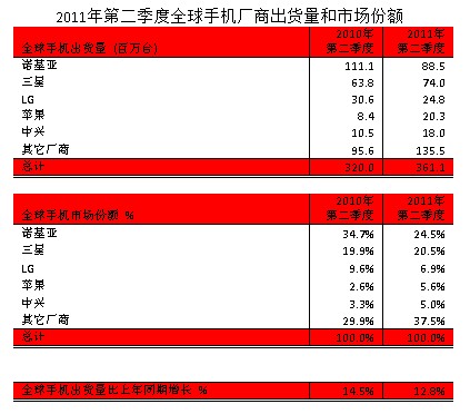 日前,據(jù)Strategy Analytics最新研究顯示,2011年二季度全球手機(jī)出貨量比去年同期增長13%,達(dá)到3.611億臺。諾基亞出現(xiàn)自1999年以來最大下滑,而蘋果已經(jīng)接近排名第三的LG。
