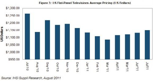 高檔品牌與價(jià)值品牌在同樣的市場環(huán)境中激烈競爭。IHS iSuppli公司的研究顯示,7月美國平板電視價(jià)格連續(xù)第四個(gè)月環(huán)比上漲。平均銷售價(jià)格為1150美元,比6月上升1.5%,但比2010年7月下滑9%,如圖所示。尤其是,今年上半年推出的新型號(hào)銷售增長,在市場疲弱之際幫助支撐了需求。零售商也報(bào)告稱,由于價(jià)格較低,32英寸及更小尺寸的電視銷售情況改善。