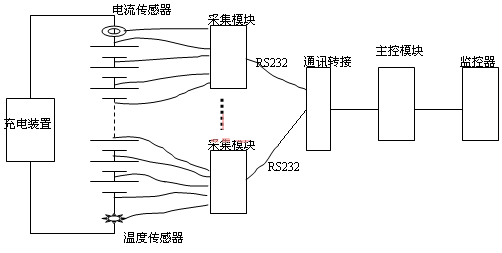在電力系統(tǒng)變電站目前使用較多的蓄電池在線監(jiān)測(cè)裝置是電池巡檢儀,電池巡檢儀又分為兩種,一種是測(cè)量蓄電池單體電壓的巡檢儀,結(jié)構(gòu)是由一個(gè)主控模塊和數(shù)個(gè)采集模塊組成,主模塊接收監(jiān)控器的命令,發(fā)送電池?cái)?shù)據(jù)到直流設(shè)備的監(jiān)控器;采集模塊中每個(gè)模塊采集10~20節(jié)電池的電壓、電流和溫度;通過(guò)直流充電設(shè)備的監(jiān)控器可顯示各單節(jié)電池電壓,判斷故障電池的編號(hào)且給出報(bào)警。這類(lèi)電池巡監(jiān)儀一般由直流設(shè)備生產(chǎn)廠家提供,在訂貨直流設(shè)備時(shí)它是選配裝置,由于功能單一、不能測(cè)試容量、且測(cè)量精度差、容易誤報(bào),限制了它的廣泛使用。測(cè)試示意圖如圖1:
