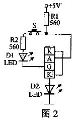 可控硅檢測(cè)電路如圖2所示,先用萬(wàn)用表檢測(cè)出被測(cè)可控硅的A、G、K極,再將被測(cè)可控硅的A、G、K三個(gè)引腳插入對(duì)應(yīng)的插孔中,接通電源,不按按鈕開(kāi)關(guān)S時(shí),發(fā)光二極管D2不發(fā)光,按一下按鈕開(kāi)關(guān)S時(shí),若發(fā)光二極管D2能持續(xù)發(fā)光,則被測(cè)可控硅是好的。