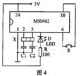 陶瓷振子檢測(cè)電路如圖4所示,外接元件455kHz或500kHz陶瓷振子X(jué),C1、c2與集成電路M50462的2、3腳內(nèi)部電路組成455kHz或500kHz的振蕩電路,將被測(cè)的455kHz或500kHz陶瓷振子插入插孔中,接通電源,按住按鈕開(kāi)關(guān)S時(shí),發(fā)光二極管能不停地閃爍發(fā)光,則說(shuō)明被測(cè)陶瓷振子是好的。
