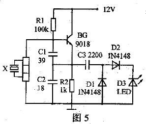 石英晶振檢測(cè)電路如圖5所示,BG與C1、C2、石英晶振X等組成高頻振蕩電路,C3、D1和D2組成二倍壓整流電路。將被測(cè)石英晶振插入插孔中,接通電源后,若發(fā)光二極管D3能持續(xù)發(fā)光,則被測(cè)石英晶振是好的。