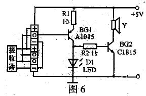 紅外線遙控接收器和紅外線遙控發(fā)射器的檢測(cè)電路如圖6所示。圖中Y是直徑為1cm,高為1cm左右的圓柱形小體積蜂鳴器,插孔的標(biāo)號(hào)“+”、“-”表示遙控接收器的電源端,“o”表示遙控接收器的信號(hào)輸出端。若檢測(cè)一體化的三端紅外線遙控接收器,將被測(cè)遙控接收器的3只引腳插入對(duì)應(yīng)的插孔中,接通電源,用一只好的紅外線遙控發(fā)射器對(duì)著遙控接收器,按住遙控發(fā)射器的任意按鍵時(shí),若D1能閃爍發(fā)光,同時(shí)蜂鳴器Y發(fā)聲,則被測(cè)紅外線遙控接收器是好的。若要檢測(cè)紅外線遙控發(fā)射器的好壞,要將一只好的紅外線遙控接收器插入插座中,按下被測(cè)紅外線發(fā)射器的任何按鍵時(shí),發(fā)光二極管D1都能閃爍發(fā)光,同時(shí)蜂鳴器發(fā)聲,則被測(cè)紅外線遙控發(fā)射器是好的。