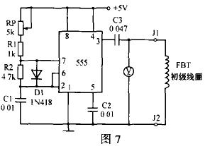 行輸出變壓器檢測(cè)電路如圖7所示,555集成定時(shí)器與外接元件構(gòu)成多諧振蕩器。調(diào)節(jié)RP可產(chǎn)生12.5~25kHz的方波脈沖,由3腳經(jīng)C3耦合輸出作為FBT初級(jí)線圈電諧振的激勵(lì)脈沖,C3與FBT初級(jí)線圈組成一串聯(lián)諧振電路。