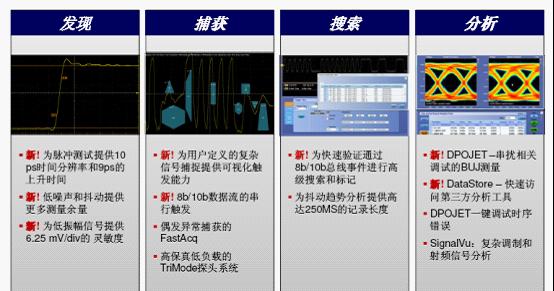 圖4:從發(fā)現(xiàn)、捕獲到搜索、分析,DPO/DSA70000D系列33GHz示波器囊括了多個(gè)行業(yè)第一和關(guān)鍵創(chuàng)新點(diǎn)。