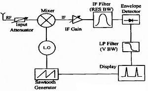 頻譜分析儀從頻譜測試的實(shí)現(xiàn)技術(shù)上可分為兩類:使用傅里葉變換(FFT)技術(shù)的數(shù)字頻譜分析儀和使用模擬濾波器的模擬頻譜分析儀(包括并行濾波器頻譜儀和掃頻式頻譜儀)。數(shù)字頻譜分析儀使用數(shù)值計(jì)算的方法處理一定時(shí)間周期的信號,可提供頻率、幅度和相位信息,對周期信號和非周期信號均能分析。特點(diǎn)是速度快,精度高,適合分析窄帶信號。模擬頻譜分析儀的掃頻式頻譜分析儀是目前最常見的類型,在掃頻頻譜分析中普遍采用超外差式方式。掃頻式頻譜分析儀可分析穩(wěn)定和周期變化信號,提供信號幅度和頻率信息,適合寬頻帶寬的快速掃描試驗(yàn)。Agilent的ESA系列經(jīng)濟(jì)型頻譜分析儀和HP8563等都屬于掃頻頻譜分析儀,其簡化原理框圖見圖1,掃頻頻譜儀實(shí)際上是多級混頻結(jié)構(gòu)。這種分析方法最核心的部分是它的混頻器和中頻濾波器?;祛l器將被測信號下變至中頻,然后在中頻上進(jìn)行處理,得到幅度。本地振蕩器采用掃頻振蕩器,它的輸出信號與被測信號中的各個(gè)頻率分量在混頻器內(nèi)依次進(jìn)行差頻變換,所產(chǎn)生的中頻信號通過中頻窄帶濾波器后再經(jīng)放大和檢波,加到視頻放大器作示波管的垂直偏轉(zhuǎn)信號,使屏幕上的垂直顯示正比于各頻率分量的幅值。本地振蕩器的掃頻由鋸齒波掃描發(fā)生器所產(chǎn)生的鋸齒電壓控制,鋸齒波電壓同時(shí)還用作示波管的水平掃描,從而使屏幕上的水平顯示正比于頻率。