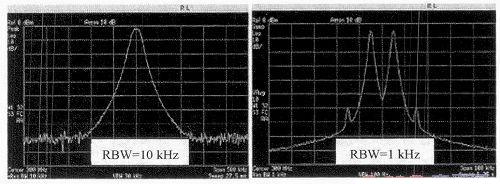 圖2是不同分辨率帶寬頻譜的顯示,可以看到分辨率帶寬RBW=10 kHz時(shí)不能辨別出載波形狀,分辨率帶寬RBW=1 kHz時(shí)可以清楚地辨別出載波形狀。