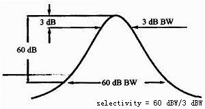 中頻濾波器的頻率選擇性是中頻濾波器的60 dB帶寬與3 dB帶寬之比,如圖3所示。它反映了頻譜儀分辨不等幅信號的能力,對于幅度相差60 dB的2個(gè)信號,其間隔至少是60 dB帶寬的一半,才可以分辨出2個(gè)信號,否則小信號可能被淹沒在大信號的裙邊中。用數(shù)字化技術(shù)實(shí)現(xiàn)的窄帶帶通濾波器頻率選擇性可達(dá)到5:1,模擬濾波器頻率選擇性可達(dá)到15:1或11:1。圖3為濾波器的頻率選擇性示意圖。