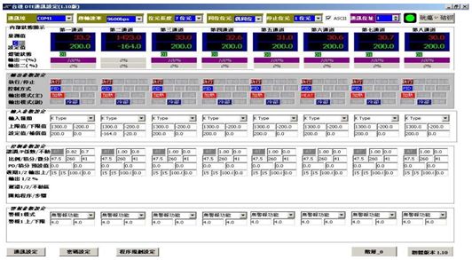 DTE對于參數(shù)的設(shè)置完全可以采用DTE專用的PC軟件來完成,全中文的DTE設(shè)置畫面簡單明了。不動區(qū)等參數(shù)需要結(jié)合現(xiàn)場實際工況來分析與設(shè)定。塑料擠出機(jī)一般可設(shè)置在:0.~2之間,而PID參數(shù)可以借助AT自動完成。