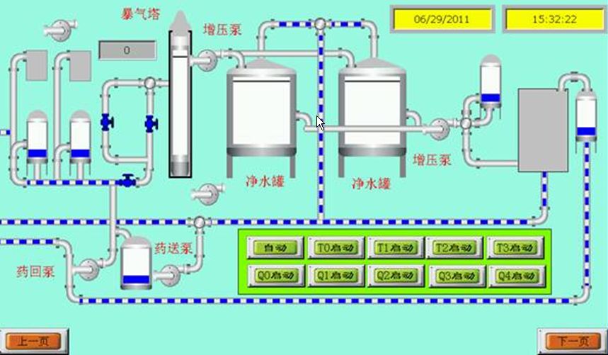 觸摸屏主要功能是顯示和控制制水過程中的數據以及水泵電磁閥的的運行狀態(tài)。PLC輸入量有各個閥門的開閉情況和各罐體的液位情況和壓力情況,其中輸入量中的液位是模擬量輸入;輸出量有水泵的啟動停止,電磁閥的開閉,報警等等。圖3為部分觸摸屏的控制界面(初期設計)。