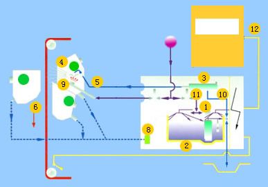 其工藝過程如圖3所示,泵①抽取液槽②的液體或水,通過過濾器③輸送到噴盤架⑤上各種噴盤④中;當(dāng)平幅運(yùn)行的織物⑥通過時(shí),液體便噴射其上;末被噴射到織物上的液體則通過回流管⑦流回到液槽;通過預(yù)過濾器⑧清除回流液體中的雜質(zhì);清洗裝置⑨⑩⑾保證了供液體單元的清洗,控制單元⑿控制整個(gè)裝置。
