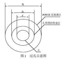 過孔是多層PCB 設(shè)計(jì)中的一個重要因素,一個過孔主要由三部分組成,一是孔;二是孔周圍的焊盤區(qū);三是POWER 層隔離區(qū)。過孔的工藝過程是在過孔的孔壁圓柱面上用化學(xué)沉積的方法鍍上一層金屬,用以連通中間各層需要連通的銅箔,而過孔的上下兩面做成普通的焊盤形狀,可直接與上下兩面的線路相通,也可不連。過孔可以起到電氣連接,固定或定位器件的作用。過孔示意圖如圖1 所示。