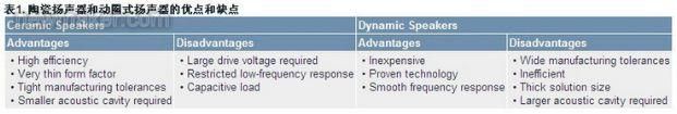 如今的便攜式設(shè)備需要更小、更薄、更省電的電子元器件。對于設(shè)計小巧的手機,動圈式揚聲器成為了制造商能否生產(chǎn)出超薄手機的制約因素。在這一需求的推動下,陶瓷或壓電揚聲器迅速興起,成為動圈式揚聲器的替代方案。陶瓷揚聲器能以超薄、緊湊的封裝提供極具競爭力的聲壓電平(SPL),具有取代傳統(tǒng)的動圈式揚聲器的巨大潛力。動圈式揚聲器和陶瓷揚聲器的區(qū)別如表1所示。