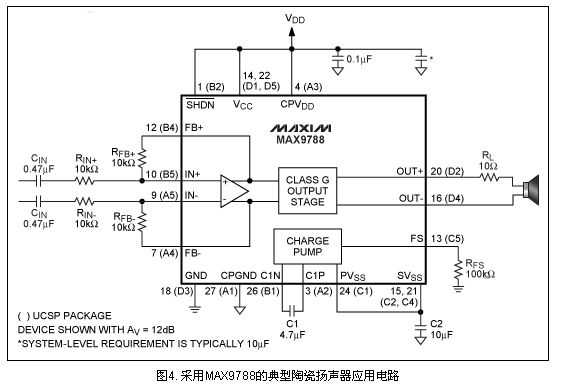 圖4中的MAX9788采用一個片上電荷泵產(chǎn)生與VDD相反的負電源電壓。當(dāng)輸出信號需要高壓驅(qū)動時,負電源電壓作用于輸出級。MAX9788提供了一種驅(qū)動陶瓷揚聲器的優(yōu)化方案,比采用AB類放大器和升壓轉(zhuǎn)換器的傳統(tǒng)方案更高效。