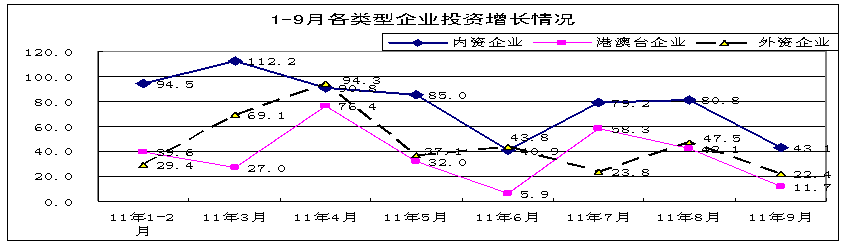 前三季度,內(nèi)資企業(yè)完成投資4821億元,占全行業(yè)的74%,同比增長(zhǎng)72.9%,高于全行業(yè)10.5個(gè)百分點(diǎn),其中私營(yíng)企業(yè)增勢(shì)突出,同比增長(zhǎng)達(dá)107.4%。外商投資和港澳臺(tái)企業(yè)分別完成投資961和710億元,同比增長(zhǎng)42.1%和33.7%,低于全行業(yè)20.3和28.7個(gè)百分點(diǎn),其中9月份分別增長(zhǎng)22.4%和11.7%。
