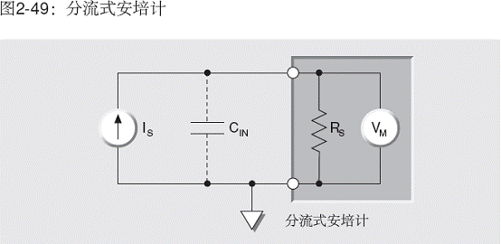 使用分流型安培計(jì)(圖2-49)時(shí),輸入電容對(duì)電流測(cè)量的影響與電壓測(cè)量時(shí)類似。分流型安培計(jì)可以看成是在其輸入端跨接了電阻器的電壓表。電路表明,輸入電容(CIN)必須以時(shí)間常數(shù)RSCIN的指數(shù)速率,充電到ISRS伏。注意,CIN是源、連接電纜和儀表電容之和。