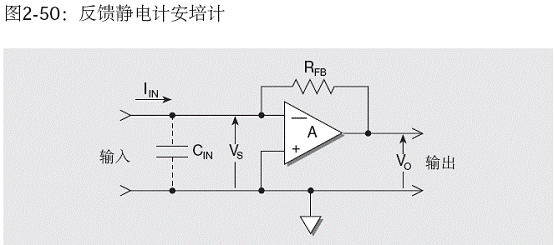 輸入電容對(duì)采用負(fù)反饋的電流表的影響與其對(duì)分流型安培計(jì)的影響不同。這種模式的電路示于圖2-50。