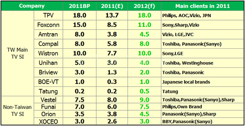 受到品牌需求減少影響,加上部分品牌增加自制比率,臺灣代工廠第三季呈現(xiàn)5.2%之衰退,但經(jīng)過庫存去化及品牌預拉升年底銷售業(yè)績影響,預估第四季將有6-9%之成長力道。但整年度看來,TPV(冠捷)還是坐穩(wěn)第一名,明年如能順利掌控PHILIPS品牌,2012年度計劃有可能朝20百萬臺邁進;鴻海(Foxconn)和緯創(chuàng)(Wistron)則受到Sony大幅調(diào)降電視需求影響,今年目標恐難以達成,明年成長力道也將受到限制;仁寶(Compal)、永碩(Unihan)、景智(Briview)主要客戶群皆以日本品牌Toshiba(主要為歐日訂單)為主,日震和歐洲經(jīng)濟困頓,也大大影響其年度績效;瑞軒(Amtran)則受到Vizio波及,整體代工量也未能達標。盡管臺灣電視代工廠有Philips、Sony、Toshiba及Vizio等國際品牌及自有品牌的加持,但還是逃不過大環(huán)境不佳的沖擊。