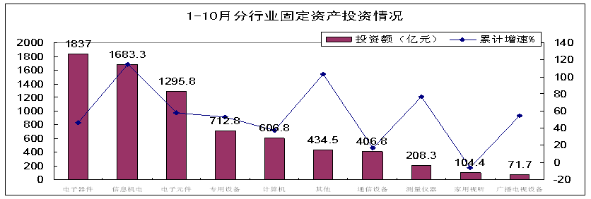 今年1-10月,電子信息產(chǎn)業(yè)固定資產(chǎn)投資持續(xù)高速增長(zhǎng),500萬(wàn)元以上項(xiàng)目完成固定資產(chǎn)投資7361億元,同比增長(zhǎng)60.1%,增速高于工業(yè)投資33.5個(gè)百分點(diǎn)。但從9月份開始,投資增速開始回落,9、10月份分別同比增長(zhǎng)35.6%和44.4%,增速低于8月份(70.8%)35.2和26.4個(gè)百分點(diǎn),同時(shí)10月份完成投資869.5億元,環(huán)比下降2.3%。