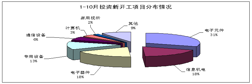 1-10月,電子信息產(chǎn)業(yè)新開工項(xiàng)目5973個(gè),同比增長(zhǎng)61.9%,增速比前三季度提高15個(gè)百分點(diǎn)。其中電子元器件、信息機(jī)電和信息化學(xué)品制造行業(yè)新開工項(xiàng)目數(shù)增長(zhǎng)均超過(guò)60%,個(gè)數(shù)占全行業(yè)71%;通信、計(jì)算機(jī)和視聽(tīng)設(shè)備等整機(jī)行業(yè)新開工項(xiàng)目占比(10%)下降3個(gè)百分點(diǎn)。