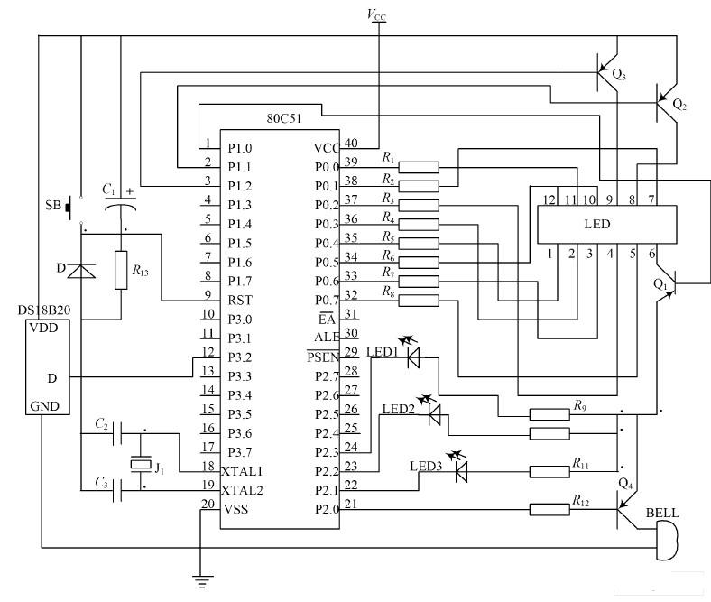 包括信號(hào)采集、系統(tǒng)控制、數(shù)字顯示、高溫報(bào)警四個(gè)部分。傳感器DS18B20 為信號(hào)采集器件所采集到的溫度信號(hào),通過內(nèi)部處理由傳感器的DQ 端送到單片機(jī)P3. 2 端口,經(jīng)單片機(jī)的計(jì)算處理后,由P0 口和P1 口分別作為4 位共陽數(shù)碼管的段控信號(hào)和位控信號(hào),共同完成對(duì)所測溫度值的數(shù)字顯示,最高位是符號(hào)顯示,如顯示負(fù)號(hào)“-”時(shí),表示當(dāng)前溫度是負(fù)溫度,否則為正溫度;由P2. 0 端口控制蜂鳴器,當(dāng)測量的溫度超過“預(yù)設(shè)報(bào)警溫度”時(shí),發(fā)出提示音報(bào)警; P2. 1~ P2. 3 端口來控制黃、綠、紅3 個(gè)發(fā)光二極管分別表示低溫、正常、高溫三種溫度狀態(tài)。石英晶體JT 和電容C2 ,C3 共同組成晶振電路; 電容C1 、電阻R 13、S B 共同構(gòu)成復(fù)位電路; 其中電阻R13為下拉電阻,SB 為手動(dòng)復(fù)位按鈕。