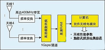 VIPER被設(shè)計成在最少的RF硬件條件下,在軟件中實(shí)現(xiàn)處理功能。圖4給出了接收器硬件的模塊示意圖。執(zhí)行單階下變頻后,在四個信道的每一個信道的IF信號以每秒1G的采樣率被采樣。所采集樣本信號存儲在RAM中,并由計算機(jī)處理。