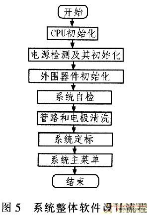 該系統(tǒng)軟件開發(fā)采用ATMEL公司提供的AVRStudio開發(fā)環(huán)境,并在該開發(fā)環(huán)境中內(nèi)嵌了支持C語言的GCC。分析儀軟件全部采用C語言編寫,這樣開發(fā)周期縮短,維護便捷。該系統(tǒng)軟件設(shè)計采用層次化模塊化結(jié)構(gòu)設(shè)計,共分為兩個層次,第l層是按照硬件各個功能模塊編寫相應(yīng)的驅(qū)動和接口程序,包括液晶顯示、打印機、按鍵處理、步進電機、A/D采集轉(zhuǎn)換、系統(tǒng)時鐘、檢測和電源管理等模塊;第2層是在第1層的基礎(chǔ)上按照使用功能編寫的應(yīng)用程序模塊,有主菜單、樣本分析、質(zhì)控分析、質(zhì)控統(tǒng)計、系統(tǒng)設(shè)定、系統(tǒng)校準(zhǔn)、電極清洗、數(shù)據(jù)儲存及查詢和系統(tǒng)自檢等模塊。圖5中給出系統(tǒng)整體軟件設(shè)計流程。