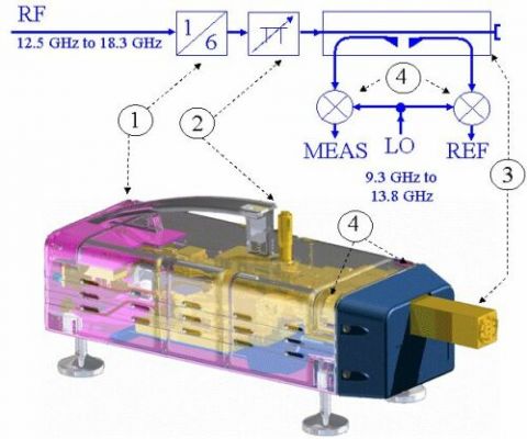 圖1顯示了R&S ZVA-Z110內(nèi)部的CAD結(jié)構(gòu)圖和原理框圖該變頻模塊包含用作隔離參考和測量信號的通道源倍頻器、可調(diào)節(jié)波導(dǎo)衰減器、定向耦合器這些參考和測量通道通過諧波混頻器進(jìn)行下變頻