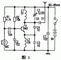 圖1是較為經(jīng)典的1.5km單管調(diào)頻發(fā)射機(jī)電路。電路中的關(guān)鍵元件是發(fā)射三極管,多采用D40,D5O,2N3866等。工作電流為60--80mA。但以上三極管難以購到,且價(jià)格較高,假貨較多。筆者選用其他三極管實(shí)驗(yàn),相對易購的三極管C2053和C1970是相當(dāng)不錯(cuò)的,實(shí)際視距通信距離大于1.5km。筆者也曾將D40管換成普通三極管8050,工作電流有60--80mA,但發(fā)射距離達(dá)不到1.5km,若改換成9018等,工作電流更小,發(fā)射距離也更短,電路中除了發(fā)射三極管以外;線圈L1和電容C3的參數(shù)選擇較重要,若選擇不當(dāng)會不起振或工作頻率超出88--108MHz范圍。其中L1,L2可用0.31mm的漆包線在3.5mm左右的圓棒上單層平繞5匝及10匝,C3選用5-20pF的瓷介或滌綸可調(diào)電容。實(shí)際制作時(shí),電容C5可省略,L2上也可換成10-100mH的普通電感線圈。若發(fā)射距離只要幾十米,那么可將電池電壓選擇為1.5-3V,并將D40管換成廉價(jià)的9018等,耗電會更少,也可參考《電子報(bào)》2000年第8期第五版(簡易遠(yuǎn)距離無線調(diào)頻傳聲器)一文后稍作改動。圖1介紹的單管發(fā)射機(jī)具有電路簡單,輸出功率大,制作容易的特點(diǎn),但是不便接高頻電纜將射頻信號送至室外的發(fā)射天線,一般是將0.7--0.9m的拉桿天線直接連在C5上作發(fā)射的,由于多普勒效應(yīng),人在天線附近移動時(shí),頻漂現(xiàn)象很嚴(yán)重,使本來收音正常的接收機(jī)聲音失真或無聲。若將本發(fā)射機(jī)作無線話筒使用,手捏天線時(shí),頻漂有多嚴(yán)重就可想而知了。